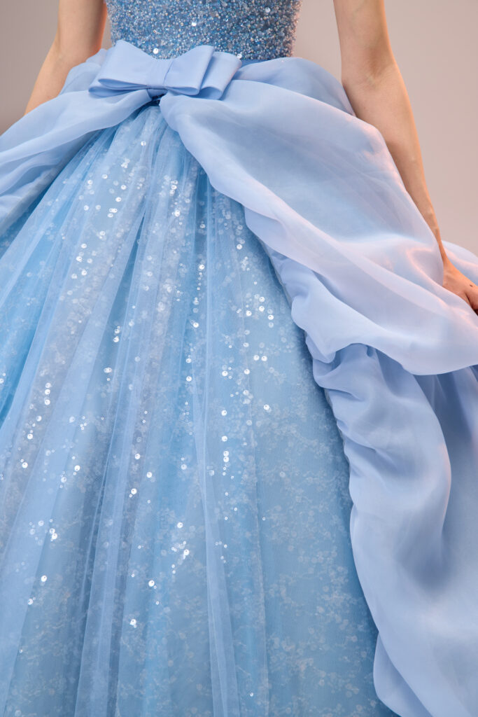 透明感のある色合いは、まるで柔らかな光をそのままドレスに閉じ込めたかのようで、